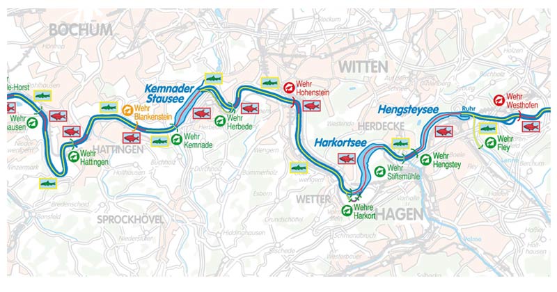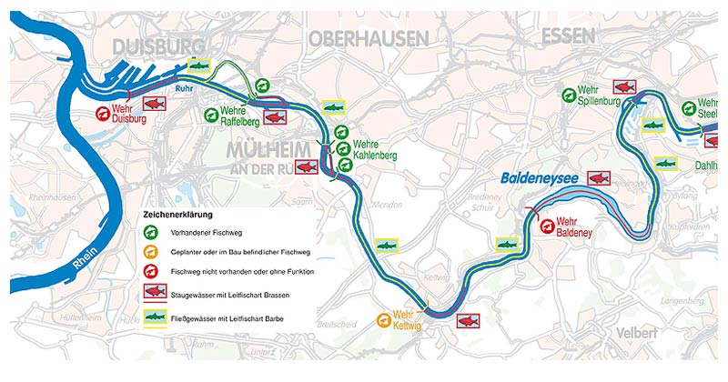 Für die untere Ruhr existiert bereits ein „Konzept zur Wiederherstellung der Fischdurchgängigkeit an den Wehren der unteren Ruhr“, das in Zusammenarbeit von Staatlichen Umweltämtern, Landesanstalt für Ökologie, Bodenordnung und Forsten und Ruhrfischereigenossenschaft erstellt wurde. An 11 Wehren ist die Durchgängigkeit bereits wieder hergestellt. Die Umplanung der übrigen Wehre läuft und wird in den nächsten Jahren realisiert.